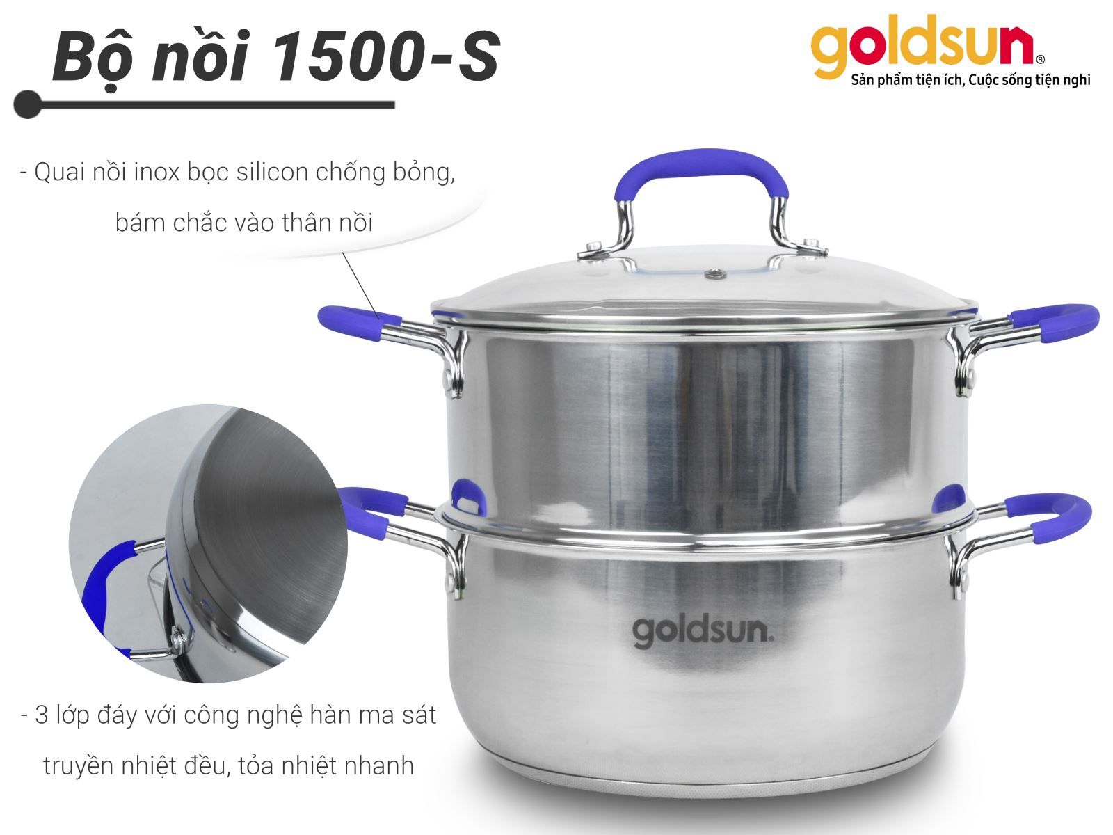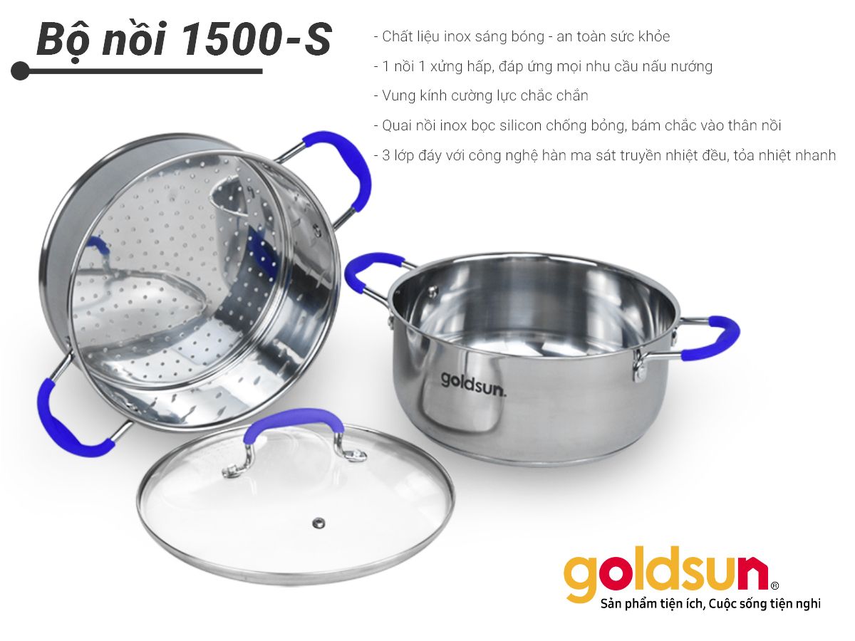 Bộ nồi xửng hấp Goldsun GPS1500-S bền đẹp, hạn chế han gỉ theo thời gian, đáp ứng nhu cầu sử dụng phong phú và là sự lựa chọn phù hợp của người tiêu dùng Việt.