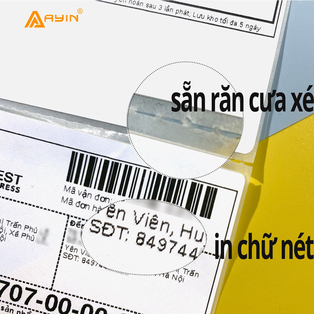 - Giấy in là loại tem nhiệt 3 lớp chống nước có sẵn keo dán