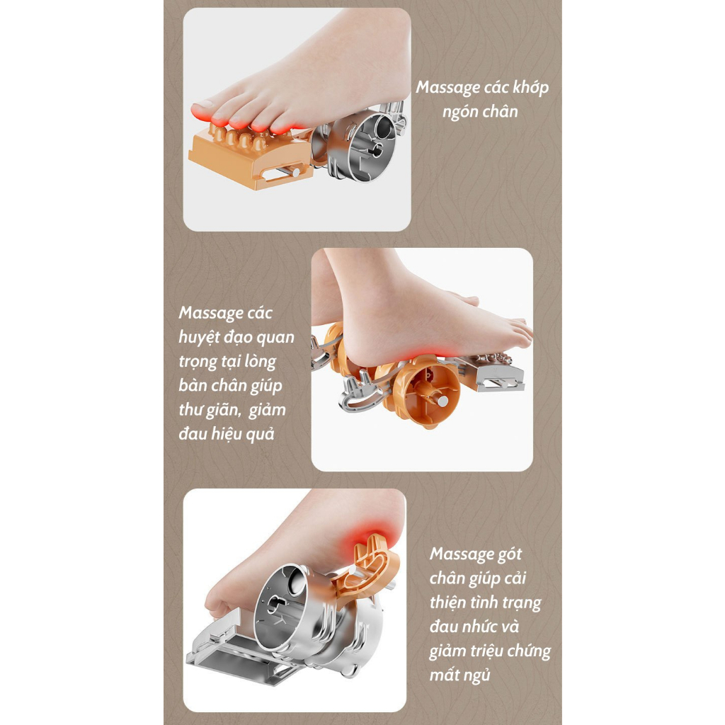 Điểm nổi bật: Máy massage toàn bộ bàn chân bắp chân, và cả vùng gót chân với đầy đủ các tính năng như bi xoay, túi khí co bóp và nhiệt hồng ngoại